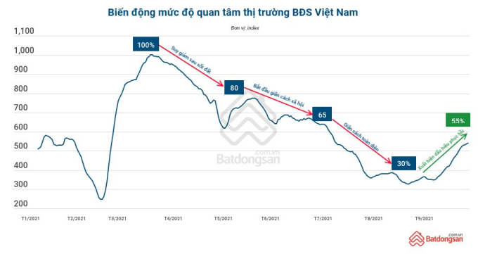 Theo báo cáo của Batdongsan, mức độ quan tâm đến thị trường trên phạm vi toàn quốc bắt đầu phục hồi từ thời điểm tháng 9, lên đến 55%. Các chuyên gia dự báo, sau thời gian dài dồn nén, trong quý 4, đặc biệt là tháng 11 và 12 năm nay sẽ là thời điểm phù hợp để giới đầu tư đón sóng thị trường.